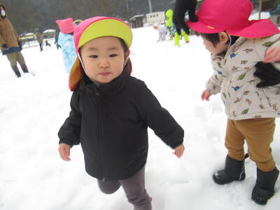 今日も雪が積もっていたので、園庭に出て雪遊びをしました。今日は、くじら山ではなく、小さく積もった雪の山からそり遊びを楽しみました。小さい山でしたが、スリルがあって楽しそうでした。しばらくすると、雨が降ってきましたが、少しだけ雪遊びを楽しむことができました。