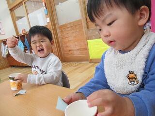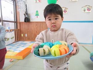 今日は升作りを完成させました。昨日鬼のパンツをマジックで模様を描いて、今日は鬼の目玉をシールで貼りました。怒ってる顔や泣いている顔や驚いた顔など、様々な表情の可愛い鬼ができました。また、節分で使いたいと思います。