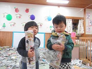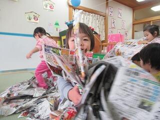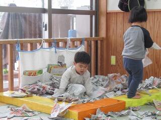 今日は新聞遊びをしました。以前使った新聞紙を絵本コーナーに集めてプールにして手足をばたばたして泳ぐ真似をしたり、寝転んで新聞紙のお布団にしてみたり、丸めておにぎりにしていると、「巻いて」と子ども達。大きな新聞紙にちぎった新聞紙を乗せて具材に見立ててのりまきを作ってあげると、「〇〇ちゃんも作ってー」と新聞紙をもってきてのりまきを大量に作りました。みんながのりまきをもって食べる真似を楽しみました。「持って帰るー」と言う子ども達。袋を出してあげると、せっせと作ったのりまきやおにぎりなどを詰めてました。