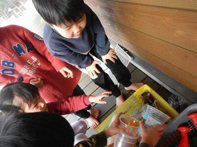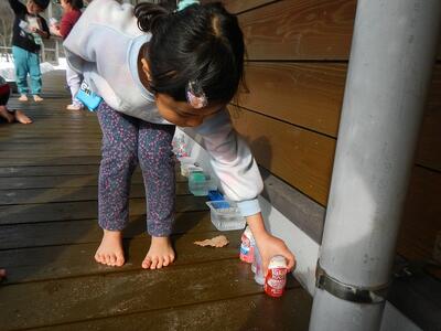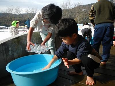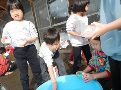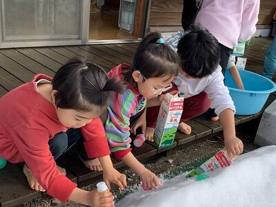 昨日の氷探しが楽しかったようで、今朝も登園前や登園中に見つけた氷の話をしていました。園の駐車場で見つけた氷を持ってきてくれた園児が、朝の会で持ってきた氷を見てもらおうとすると…氷はすっかり解けていました。「解けちゃったなー。」「でも寒かったらまた氷いなるじゃない?」「カップに入れて、テラスに置いたらいいだん。」などと、いつの間にかどうやったら氷が作れるのか考えはじめ、作ってみたいなの気持ちが膨らんできたようでした。そこで、氷づくりに使うカップ探しの旅に出掛けました。テラス、ホール、給食室に事務室…園内を回っていろんな容器を集め、準備完了‼水を入れて…どこに置く?テラスや雪の中など様々な場所に置いてみました。昼寝の後と、明日の朝と、月曜日に見てみよう‼ということになりました。昼寝後にのぞくと、「水だわー。」と。さあ、はたして氷になるのでしょうか?