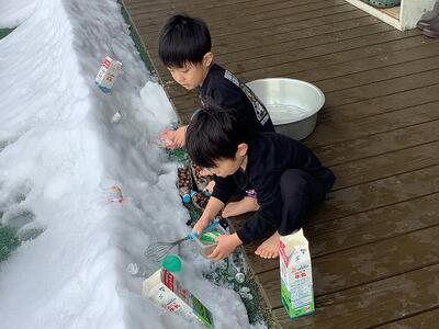参観日の後は、外へ出かけました。氷作りの続きです。「宇宙人に降りてきてもらって凍らせてもらおう‼」ということになり、宇宙人をどうやったら呼べるのか…「雪玉を空に投げて届いたら降りてくるじゃない?」と雪玉をいくつも作って空に向かって投げていました。残念ながら宇宙人はきてくれませんでしたが、キラキラの氷を見つけて大喜びでした。