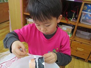 今日からお雛様作りを始めました。今日は、お内裏様とお雛様の体と顔作り‼花紙や折り紙をちぎって紙コップに貼りました。「あれ?真っすぐちぎったのに丸くなっちゃったわ」「途中でちぎれちゃったわ」とちぎる紙の向きでいろいろな形になっていくことを不思議そうにしていた子ども達でした。また、黒い花紙を「海苔みたーい‼食べよう‼ぱくっっ」と面白い発想をする子も‼(確かに・・・)そして、見本のおひなさんにざらざらした物が使われていることに気付いた、たんぽぽさん‼「これ塩か?砂糖か?」と手で触り、どっちが正解なのか友達同士で当てやっこしていましたよ~。正解は、どっちなのでしょうか♪