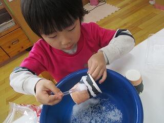 今日も、おひなさん製作‼金曜日の続きでソルトペインティングをしました。塩が固まったので、塩の上に”チョンチョン”と色をのせると、色が広がり、きれいに染まっていました。「きれい‼色が広がった~」と子ども達も感動♡もう一度見たくて何度も何度も色をのせていましたよ。逆に塗りすぎて筆に塩が付いてしまいましたが・・・(笑)本日も4名のソルトペインティング職人さんでした♪