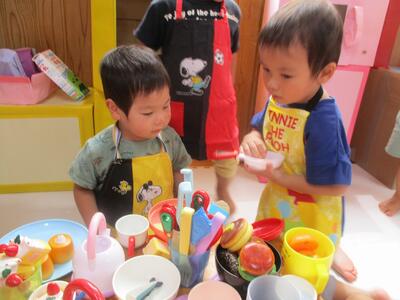 大好きなままごとコーナーが新しくなり、大喜び。エプロンをつけて早速ままごと開始しました‼テーブルの上はごちそうでいっぱいです。「いただきまーす。」とあいさつしてみんなでおいしそうに食べるマネをしていました。改築パーティーを楽しみました。