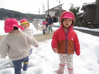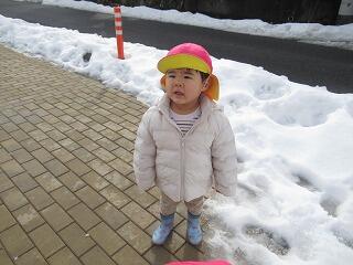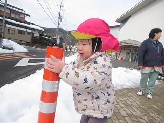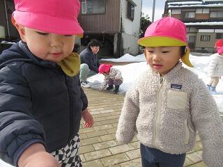 今日は小学校までお散歩に出かけました。雪が所々残っており、雪を踏みながら感触を楽しみました。降り始めの雪に比べて少し硬く、踏んでみると、サクっと音がしてそれが楽しい子ども達。小学校にはたくさんの雪が残っており、握って雪玉にして投げてみたり、雪が固まって小さな山になっている所を登って楽しみました。
