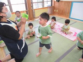 今日は食育集会の後、皆で作ったカエルのカスタネットを使ってカエルの歌に合わせて楽器遊びを楽しみました。上手にカチカチ鳴らしたり、ならせない子もみんなの真似して鳴らそうとしていました。楽器遊びの後は、ピョンピョン跳ねてカエルさんになって運動遊び表現遊びを楽しみました。みんなでピョンピョンカエルになりきって楽しみました。
