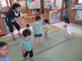 今日はお部屋でゆっくり過ごしました。風船大好き自分でポーンしたりひもつき風船ではサッカーのように蹴って遊んだりしました。