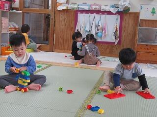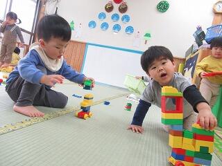 今日は室内でブロック遊びをしました。ブロックを箱状にして中に小さなブロックを入れて卵のようにパカッっと割って中から出てくる仕掛けを作ってあげると、喜んで何度も割って小さなブロックが転がると「ピヨピヨが」と追いかける遊びを楽しんだり、ブロックを組み合わせて線路のように電車を走らせてみたり、踏切を作ってあげると、「カンカンカン」と踏切を何度も下げて楽しんだり、同じブロックを並べてお店屋さんごっこのように楽しみました。