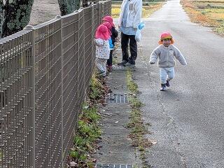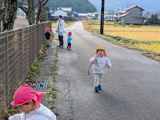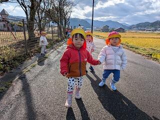 今日は、発表会練習の後、農道までお散歩に出かけました。草花は少し枯れてましたが、何かの実を見つけて引っ張ってみたり、カタツムリを見つけてみんなで囲んで観察してみたり、自然に触れて楽しみました。大きな鳥が川の向こう側で飛んでいるのを見て「あ!大きな鳥さん!」と指さして眺めたり思い思いに楽しみました。