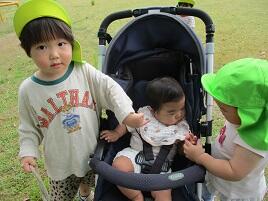 今日は、ベビーカーに乗って園庭へお散歩。みかん組さんや色々な先生に話しかけてもらったり、たんぽぽを触ったり、揺れる葉っぱを眺めたりして楽しみました。涼しい風を感じて嬉しそうにしていました。