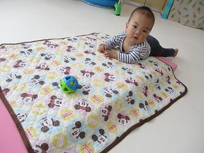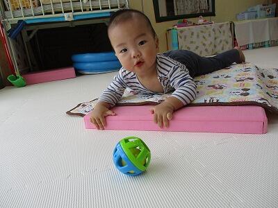 今日は、マットを使って保育室に小さな坂を作ってみました。玩具を取りに行こうと頑張って登ったり、降りたりしていました。そのまま保育室をぐるっとずり這いで探索。ぞうを見つけて指をさしながら「あ!」と嬉しそうにしていました。
