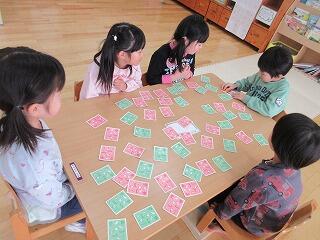 今日は、たんぽぽ組さんと手作りカルタと椅子取りゲームをして遊びました。初めて手作りカルタを見るたんぽぽさん‼「わあ‼すごい。これ作ったやつ?」と始まる前からワクワク‼さくらさんが読み手となり、スタート‼「これであっとる?」と取ったカルタをさくらさんに確認するたんぽぽさん‼また、カルタを取る際に友達と重なってしまった時には、「〇〇くんの方が先だったけ、○〇くんが取っていいよ」などさくらさんがリードしながら進めてくれましたよ。椅子取りゲームでもお互いのクラスの友達を応援しながら大盛り上がりでした~。