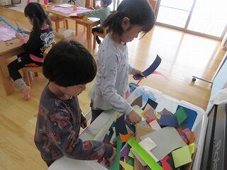 今日は、節分の枡を完成させました。鬼の手と足は、じゃばら折りに挑戦。じゃばら折りが成功すると、「見て見て~‼伸びるよ~ビヨヨヨーン♪」と伸ばしたり、縮めたりしてじゃばら折りで遊んでいました。さらに鬼にじゃばら折りの手と足をくっつけると「こんにちは、私は鬼よ。どこ行こうかしら~」と友達の鬼と楽しそうにお話をしていましたよ。可愛い枡の完成です。