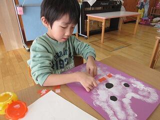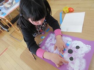 今日も2月の壁画製作の続きでシロクマ作りをしました。タンポで描いたシロクマに目や鼻を付けたり、マフラーを巻いたりして完成させました。「どの色にしようかな?」とマフラーの色を選び、シロクマにマフラーを巻く時には、「シロクマさん、寒いからあったかくしようね~」とシロクマにお話ししながら製作するさくらさんでした。皆のマフラーできっと暖かくなったでしょうね~。