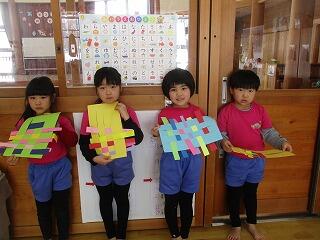 最近すごろく遊びを楽しんでいるさくらさん。ならば、自分たちで作ってみよう!!ということですごろく作りを始めました。今日はマスになる紙に言葉や絵を書いてみました。「何回休みにしようかな?」「先生と○○する!にしようかな?」など友達と楽しそうにお話も弾んでいました。明日は、班ごとに今日作ったものをつなげてすごろくを完成させる予定です。