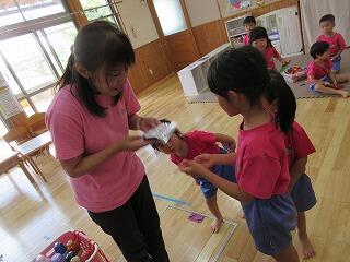 夏の遊びとして色水遊びを楽しんでいる、さくらさん。今日は、クレープ紙で色を出した色水を使って実験をしました。色水遊びの中でも、いろいろな色を混ぜると変わった色が出来ることを知っているさくらさん。今回は、2つのボトルを用意し、両方ボトルに同じ順番で4色の色水を順番に入れていきました。すると不思議・・・1本目のボトルの色水は色が混ざりましたが、もう1本のボトルは、虹色みたいに色が分かれ、「え~すごい‼何で何で?虹色になっとる‼同じ色入れたのに何で?」と友達と目を合わせて不思議そうにしていましたよ。保育者が虹色になった方には、魔法の粉が入っていることを言い、何が入っているのかヒントを出すと「塩‼」とすぐに分かったようです。ボトルを動かしても色が混ざらず、またこれも不思議‼「めっちゃきれいだな~」と不思議がいっぱいの実験タイムでした♪