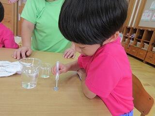 今日の科学とあそぼうは、水を使っての実験。ストローを使ってコップからコップへ入れる遊びでは、上手く入れれると、「わ~‼これすごい‼」と驚く子も‼驚くことはまだまだ沢山‼次に用意されたのは、1円玉‼スポイトを使ってその上に水をのせる実験では、1円玉から水があふれないように慎重に慎重に水をのせていましたよ。水をのせた1円玉を横から見ると、ぷくっとした形をしていてこれもまた不思議‼最後は、透明なフイルムをコップにかぶせて逆さにしての実験‼逆さにしても水がこぼれてしまわないことに、「えっ?何で?」と友達と目を合わせながら一番驚いていた子ども達でしたよ~。水の表面張力は、すごいですね‼