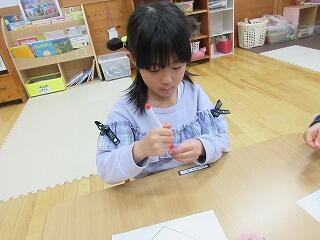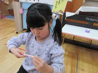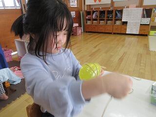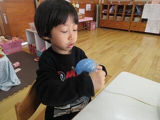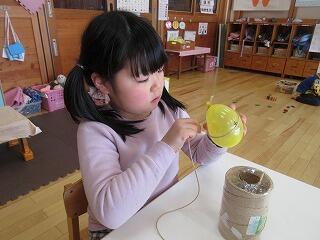 今日から、お雛様製作をスタート‼お雛様とお内裏様の体を作りました。水風船に麻紐をぐるぐる巻いて・・・。巻いていきますが、水風船がつるつるしているのでうまく巻けず・・・「ん・・・?どうやってするんだ~。むず~」と。真剣な表情のさくらさん・・・。いろいろ巻き方を変えながら上手く巻けるやり方を見つけていました。どんな風に仕上げっていくのか楽しみですね~。