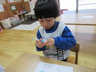 今日も2月の壁画製作の続きでシロクマ作りをしました。タンポで描いたシロクマに目や鼻を付けたり、マフラーを巻いたりして完成させました。「どの色にしようかな?」とマフラーの色を選び、シロクマにマフラーを巻く時には、「シロクマさん、寒いからあったかくしようね~」とシロクマにお話ししながら製作するさくらさんでした。皆のマフラーできっと暖かくなったでしょうね~。