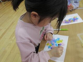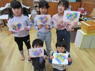 今日は、お花紙を使ってハートを作りました。消しゴム付の鉛筆を使い、花紙を丸くしてハートの形にペタリ‼指先で花紙を押さえて手首を回してクルリ♪慣れるまでは、「どうしたら出来る?」と苦戦気味でしたが、何個もすると「あっ。だんだん上手になってきた」と楽しくなってきたようです。貼っていくと立体感のあるハートに変身★「お花畑みたいできれい♡」と、お花畑をイメージしたり、「モフモフして気持ちいい」と花紙の感触を味わったりしながら製作をしていたさくらさんです。