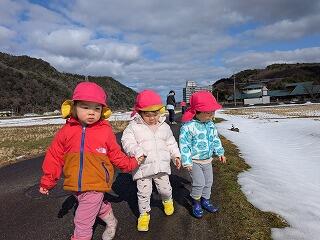 今日は小学校までお散歩に出かけました。雪が所々残っており、雪を踏みながら感触を楽しみました。降り始めの雪に比べて少し硬く、踏んでみると、サクっと音がしてそれが楽しい子ども達。小学校にはたくさんの雪が残っており、握って雪玉にして投げてみたり、雪が固まって小さな山になっている所を登って楽しみました。