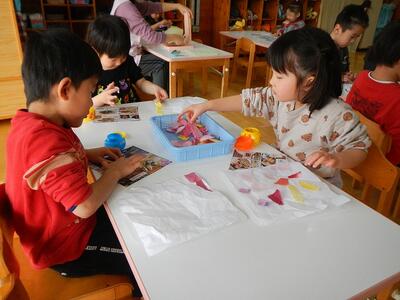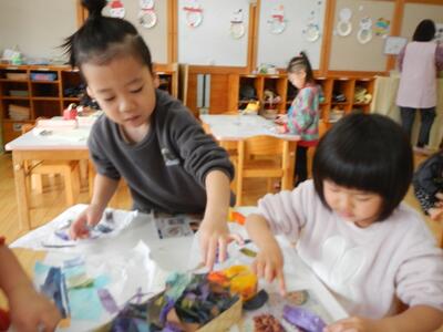 ひな祭りに向けて雛人形作りを始めました。今日は、着ものつくり。ちぎった和紙を紙に貼っていきました。色や形を選びながら楽しそうに張り付けていましたよ。どれもカラフルできれいな着物に仕上がりました。