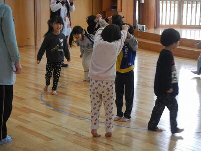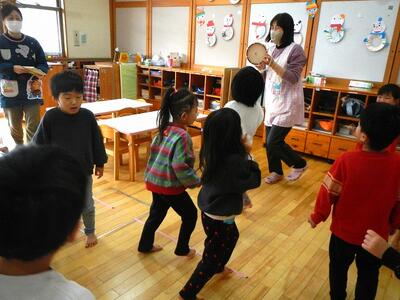 2グループに分かれて遊びました。さくら組さんと一緒に遊んだり、ゲームをしたりして楽しみました。