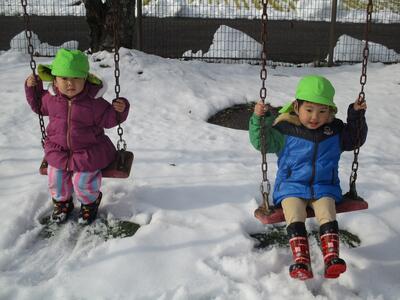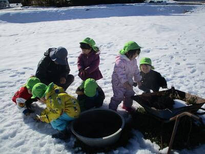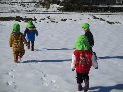 その後は雪遊びへ…園庭に10㎝ほどは雪が残っていたので、ウキウキしながら雪に触れて楽しんでいました!