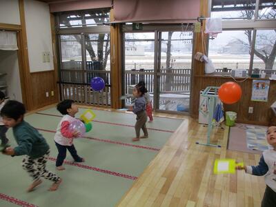 カルタのあとは、羽つきならぬ【風船つき】を楽しみました。フワフワ浮かぶ風船を元気に追いかけ、思いきり羽子板でバチーン!としていて気持ち良さそうでした(笑)