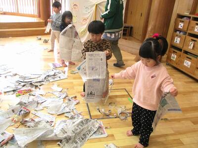 その後は、ホールで全クラス一緒に新聞紙で遊びました。ちぎってポイっを繰り返しているとあっという間にホールは新聞紙だらけ…寝転んだりかきわけたりしながら大盛上がりで遊んだ子ども達でした♪