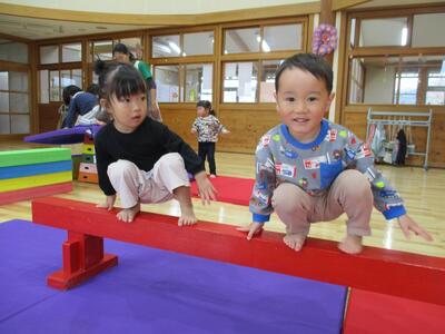 運動会ではおうちの人と手をつないで渡った平均台でしたが、今では自力で渡ることもできるようになり成長の早さを感じさせてくれました♪