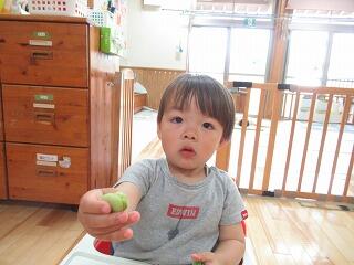 今日は朝の会の後に、給食室からさやに入ったそら豆をもらいました。はじめに向き方を見せてあげると、興味深々の子ども達。少し切れ目を入れてあげると、上手に向いて中の豆を取り出して「とれた!」と嬉しそうに見せてくれました。