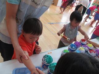 今日はちゅうりっぷ、たんぽぽ組のお店屋さんごっこに招待してもらい、ちょこばななやかき氷、焼きそばなどを買ったり、食べる真似をしたり、金魚すくいや、ワニワニパニックなどのゲームを楽しみました。一つ一つのお店に行くとキラキラのシールをもらえるので、たくさん手に貼ってもらってとてもうれしいみかん組さんでした。
