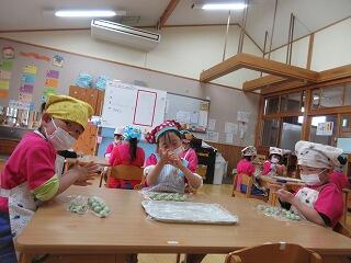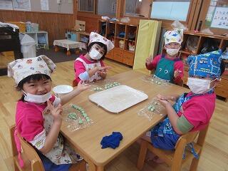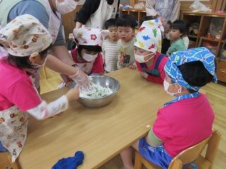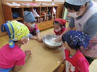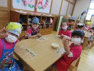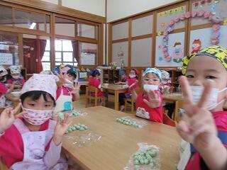 今日はよもぎ団子作りをしました。先週以上児クラス全員でよもぎをたくさん摘んだので、たくさんのよもぎがあり、団子粉と混ぜるととてもきれいな若草色になりました。材料の説明や作る工程を見せながら団子を作ると、「混ぜたら何色かな?」と楽しそうな子ども達。においをかいでみたらよもぎのいい香りがしました。小さくちぎってそれぞれ団子をたくさん作りました。丸める表情はまるで職人さんのようで、きれいなまん丸い団子がたくさんできました。給食でおいしく皆で頂きました。
