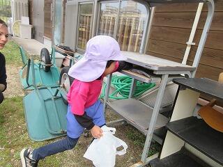 今日は、久しぶりに労働の日で部屋を掃除しました。まずは、雑巾絞りに挑戦‼昨年度の当番活動の時からしたことがあったさくらさん‼手首をしっかりとひねりながら「うーーーん」と掛け声付きで絞っていましたよ。昨年度からの積み重ねで上手に絞れるようになっていたことにビックリ‼最後は仕上げをしますが、ほとんど水気もなく一気に上達しているさくらさんでした。部屋の中もきれいにお掃除♪「ここも汚れとるわ」と子ども達自ら汚れている場所を探して掃除してくれました。