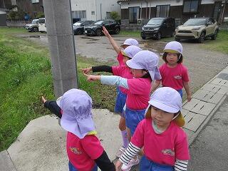 今日は、大瀬を探検しました。今日の目的は、保育園から出発してからどんなお店などがあるか皆で見つけること‼中学校や小学校を見つけ、歩いていくと郵便局やセブンイレブンも発見‼セブンイレブンにはよく行くようで「お菓子やジュースもいっぱい売ってあるんだよ」と大盛り上がりでしたよ。そして大瀬の中を入っていくと、いろいろな花が咲いており、先週調べた花の名前もよく覚えていて次々口にしていた、さくらさん‼すごい‼また、花やお店だけではなく、簡単な標識も見つけて勉強した、さくらぐみ探検隊でした。大瀬だけでなく、いろいろな場所も探検したいと思います。最後は、役場の裏で遊びましたが、靴に土が付いてしまい・・・「分かった、水たまりでおとそうや」と皆できれいに洗っていました。
