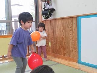 今日も一日雨が降っていたので、お部屋遊びをして過ごしました。車の玩具で部屋中を走らせたり、風船を各自が持ちまわってましたが、ひもを付けて吊るしてあげると、嬉しそうに手ではじいて楽しみました。。バレーボールのアタックのように一つ一つの風船に手で弾いて楽しんでいました。
