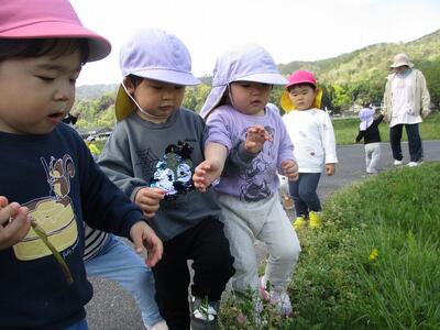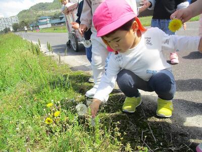 今日も、もも組とみかん組でお散歩に出掛けました。農道をぐるりと一周お散歩した後は、畑で遊びました。畑の中は、広いので走り放題‼子ども達も自由に走ることができるので、とっても楽しそうです。たんぽぽやオオイヌノフグリも咲いていて春のお花を見つけると嬉しそうに保育者に見せてくれる子ども達です。たんぽぽの綿毛も1本発見‼何人かのお友達が「フ~」と吹いてみると、綿毛が風にのってきれいに飛んでいきました~。