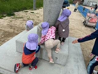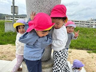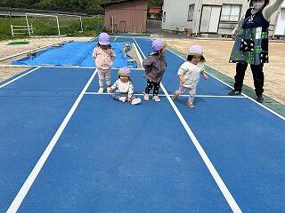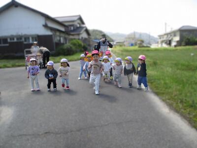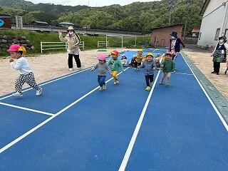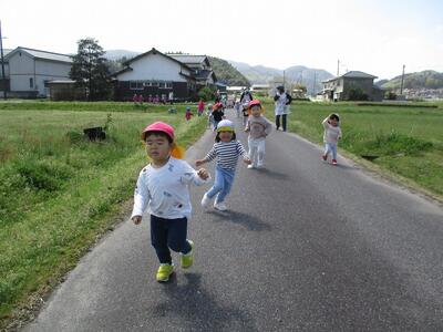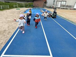 今日は、もも組とみかん組で旧小学校へお散歩に行きました。到着後は、クラスごとでヨーイドン‼もも組のお兄さん、お姉さんがトップバッターで走ってくれましたが、早く走りたくて立ってスタンバイするみかん組さんでした(笑)追い風に負けず⁉皆が元気いっぱい走りましたよ‼走り終えた後の自由遊びでも、まだまだ走り足りず、「もう1回しよう‼」と、私たち大人よりも元気で、なかなか疲れない子ども達でした。体力がありますね~。