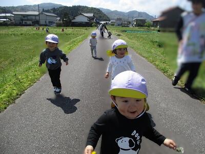 もも組とみかん組は今日も仲良くお散歩へ。まん丸の綿毛を見つけて、ふうっと力いっぱい吹いてみる子ども達でした。「よーいドンしたい!!」とのリクエストがあり、みんなで農道をかけっこしました。やっぱり速いももさんを一生懸命追いかけるみかんさん。ゴールした時はみんなとってもいい笑顔でしたよ。