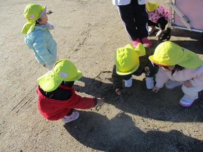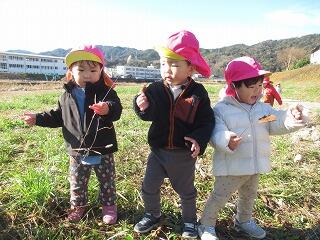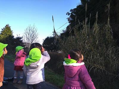 今日は製作をした後、水辺の楽校までお散歩に出かけました。川の向こう側ではショベルカーや散水車があり、動く様子をじーっと眺めたり、河原を降りていくと長い道があり、皆でかけっこを楽しみました。クルミの木のところで葉っぱや木の枝を見つけたり、クルミがたくさん落ちていたので、みんなクルミ拾いに夢中になって拾いました。葉っぱをかき分けると、次々見つかるのが楽しいのか、「どこにある?」「あったよ!」と喜ぶみかん組さんでした。