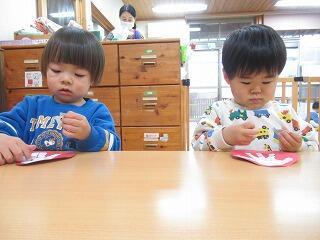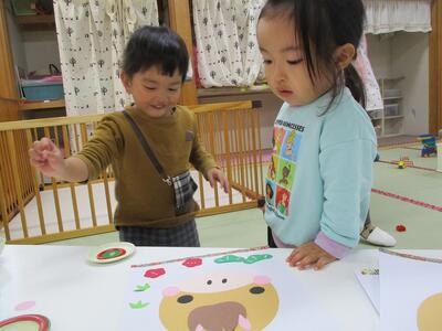 今日はお部屋で製作をしました。先日手形でだるまを作ったものに、丸シールで目玉を作りました。それぞれ目玉が上に向いたり、下の方に向いたり、真ん中に寄ってみたり、様々な表情のだるまができました。お部屋に飾りたいと思います。