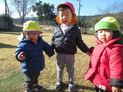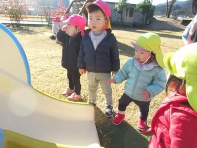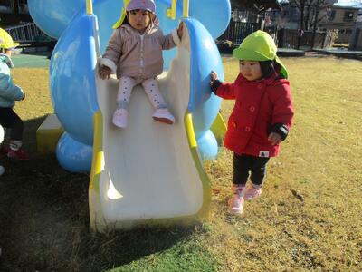 今日は、いちご組とみかん組と一緒に園庭で遊びました!順番で滑り台を滑ったり、クライミングの下をお家のようにして遊んだり、手を繋いで散策を楽しんだり、とても楽しそうな子ども達でした。みかん組の子がいちご組の子に「こっちだよ」「だめだよ」などと声を掛けてくれる姿もありました!