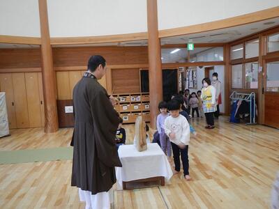 今日からたんぽぽ組さんと一緒に座禅に参加することになりました。どんなことをするのかドキドキのちゅうりっぷさんでしたが、住職さんのお話をよく聞いたり、たんぽぽさんの真似をしてみたり、初めてとは思えないほどとっても上手にできました!!「ちゅうりっぷさんすごいなあ」と褒めてもらって喜ぶ子ども達でした。静かに座って心を落ち着かせる、そんな時間も大切ですね。