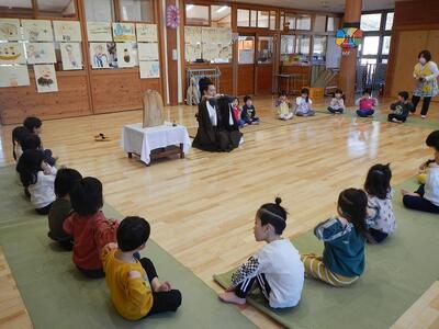 今月のお茶会は、初めてお抹茶を点てることに挑戦‼茶筅の名前を習った後、横木先生や保育者と一緒に茶筅を持ち、お抹茶を点てる感覚を覚えながら点ててみました。初めての挑戦でしたが、自分で点てたことが嬉しかったようで、「楽しかった~」と真っ先に答える子ども達でしたよ。来月のお茶会も楽しみのようです♡最後は、遅くなりましたが、勤労感謝の日で横木先生に感謝状とお花のプレゼントを渡しました。
