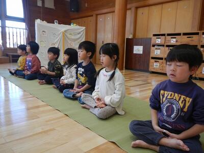 今日は、坐禅をしました。これまでは、たんぽぽ組だけで坐禅をしてきましたが、今回からちゅうりっぷ組さんも一緒に坐禅をすることになり、たんぽぽさんがお手本になって頑張ってくれました。