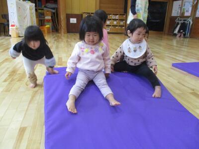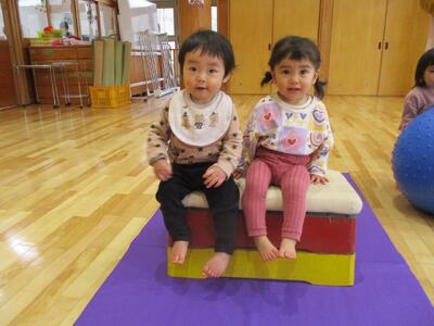 今日は、ホールで跳び箱・マット・カラー積み木・大きなボールを出して遊びました。転々と色々な遊びを楽しんで体を動かしたいちご組さん。友達と一緒に遊ぶ姿も増えてきて、「行くよ」と伝えると友達と手を繋いだり、「片付けようか」と伝えると、カラー積み木を友達と一緒に持ってきてお片づけを手伝ってくれたりする子ども達です。