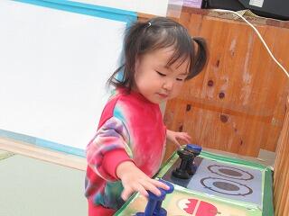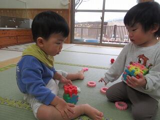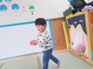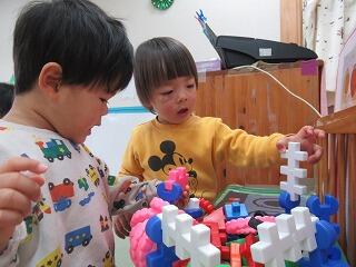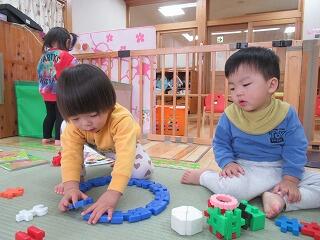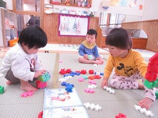 クリスマスもまだですが今日はお正月の飾りを作りました。長くつなげた2色のお花紙をねじってマーブル模様に。キレイな輪っかができました。思わず「美味しそう」なんて言葉も飛び出てきましたよ。どんな飾りができあがるのか、お楽しみに。順番を待つ間には大好きなままごととブロック。友達と一緒に集中して遊べるようになってきたちゅうりっぷさんです。