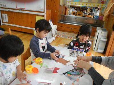 クリスマスを飛び越えて、正月飾りを作りました。ハサミでチョキチョキ。かいてある線の上を狙って、真剣にハサミで切り進めていました。スタンプ遊びもしましたよ!友達がやっているようにも興味をもって見ていたり、自分の番になるのをとても楽しみにしながら作りました。