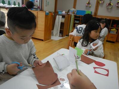 少し前に大きなクリスマスツリーを作ったさくらさん‼今日は、クリスマスツリーのオーナメント作りをしました。「折り紙でツリーを作る」「サンタさん作る」「長靴を作る」といろいろなアイデアが出て来て早速折り紙で折ったり、クリスマスの可愛い包装紙の絵を切ったりしました。作ることが楽しく、「まだまだ作りたい‼」と給食後もオーナメント作りを楽しむさくらさんでした。さくらぐみクリスマス会に向けて準備も着々と進んでいます。